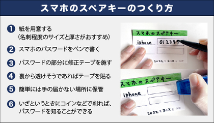 スマホのスペアキーとは「スマホのロックを解除するパスワードを記した紙を作っておくこと」だそうです。